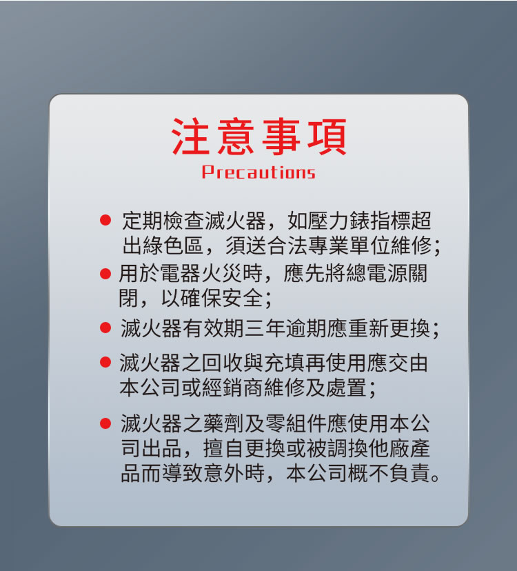 每個月自行檢查滅火器的壓力表及外觀,壓力表指針是否在綠色範圍,瓶身是否有變形、腐蝕、生鏽或損壞。